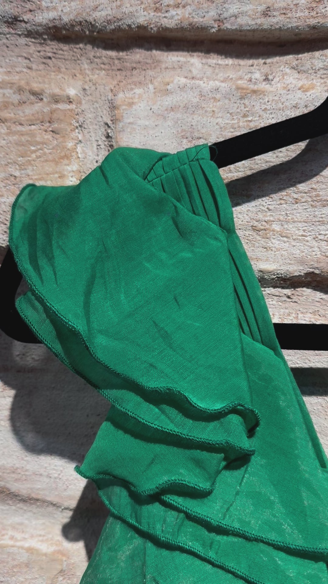 Este vestido verde con escote en V y detalles de volantes aporta un aire romántico y elegante. Su abertura lateral añade un toque seductor, ideal para destacar en eventos especiales. ¡Deslumbra con esta pieza única y sofisticada!